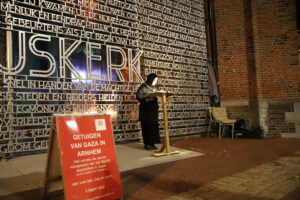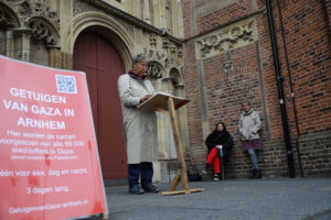 In het zicht van deze genocide en bewust gecreëerde hongersnood vragen we ons af: wat kunnen we doen? Niet veel, maar we kunnen opstaan als getuigen. Via media en online kanalen bereiken ons voortdurend beelden en verhalen. In die zin is iedereen die meekijkt, een getuige. Wij kiezen ervoor stil te staan bij de verloren mensenlevens — in waardigheid, in stilte. Je zou het ook een ritueel, gedenken of gebed kunnen noemen. Maar geen herdenking, of verwerking want het is helaas nog niet voorbij. De onmenselijke misdaden in Gaza door de Israëlische regering willen we niet, kunnen we niet en mogen we niet accepteren. Evenmin de Nederlandse medeplichtigheid.